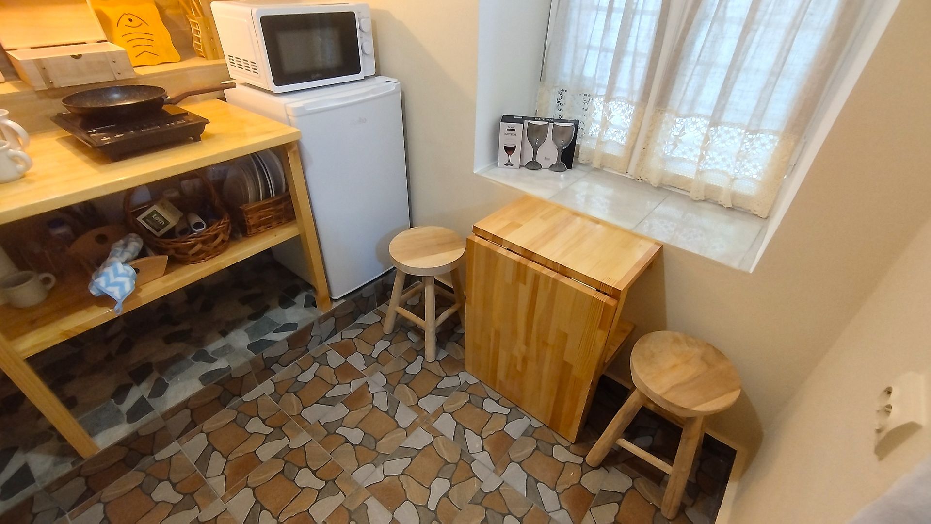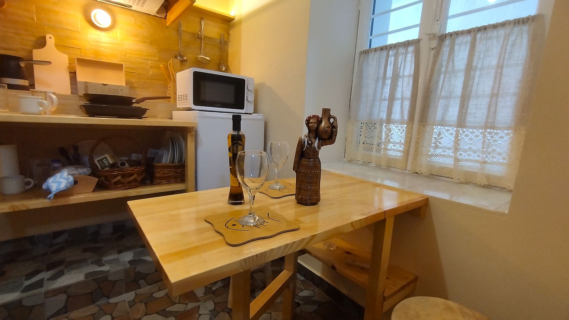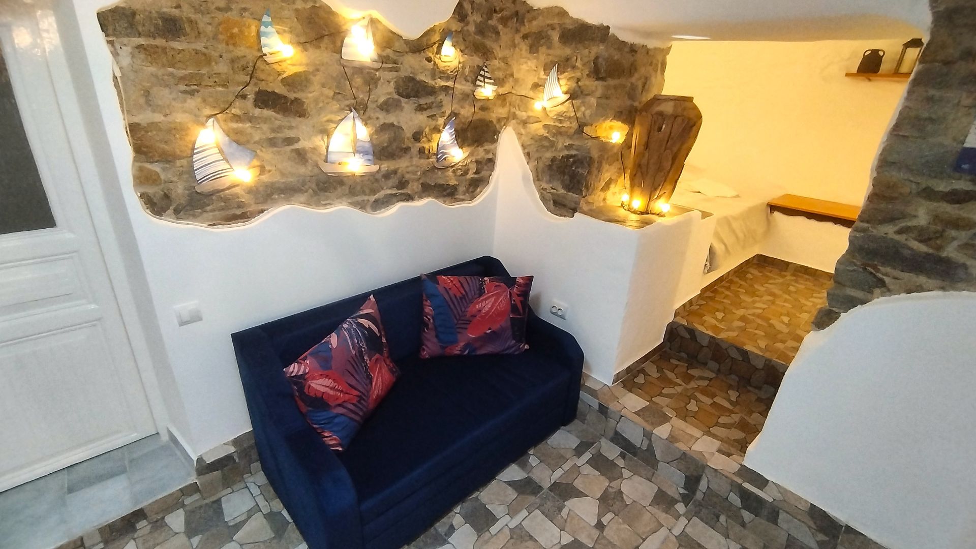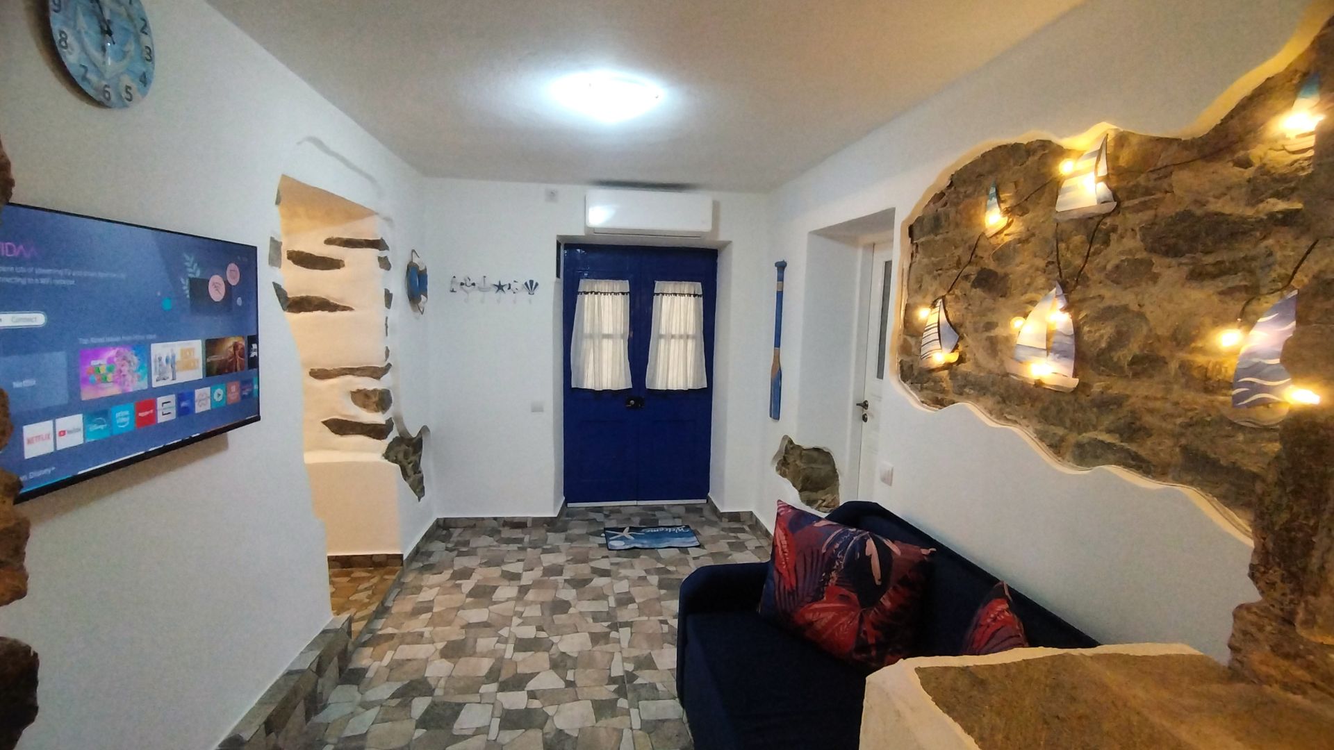 Квартира находится на первом этаже пятиэтажного дома с отдельным и удобным входом, всего в 150 метрах от пляжа, и может принять до 6 гостей. Сам дом был построен в 1924 году из натурального камня, является культурным наследием города Кавала, и находится под охраной Министерства Культуры Греции.